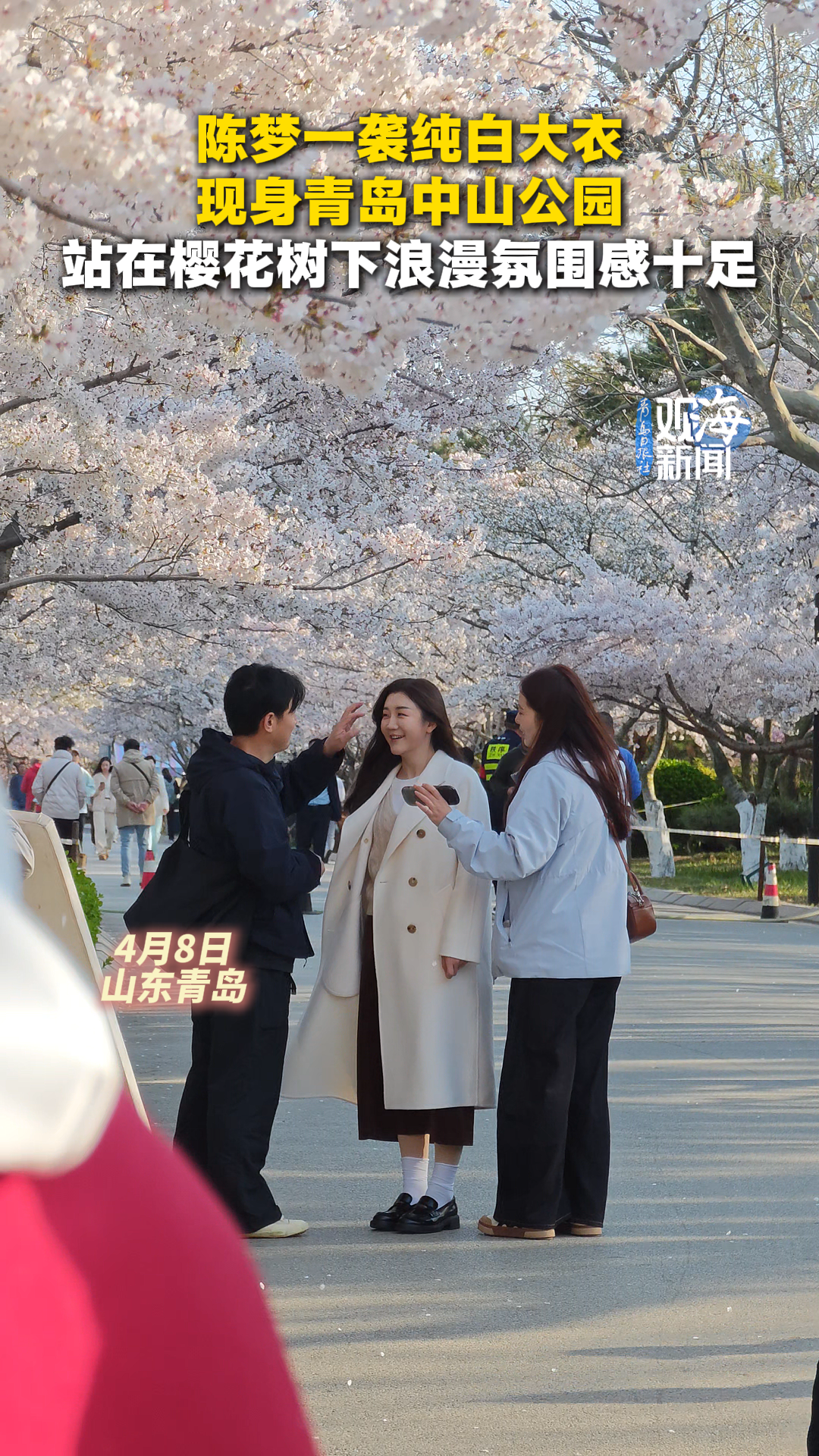陈梦一袭纯白大衣现身青岛中山公园,站在樱花树下浪漫氛围感十足