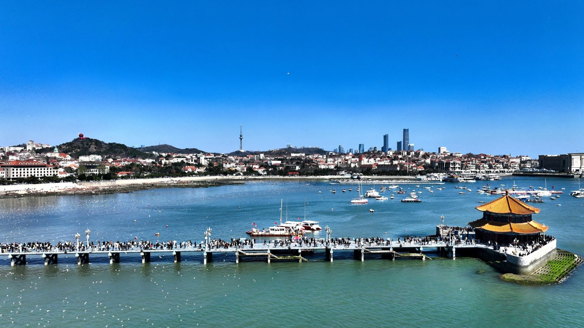 青岛:假日尾声,“人海”“鸥群”相映成趣